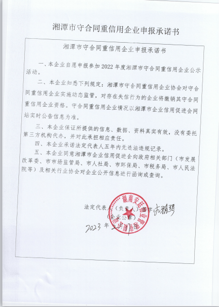 本企業(yè)根據(jù)《湘潭市守合同重信用企業(yè)申報(bào)規(guī)定》等編制 2022 年度企業(yè)信用報(bào)告書,并保證本報(bào)告書內(nèi)容真實(shí)、準(zhǔn)確、完整。