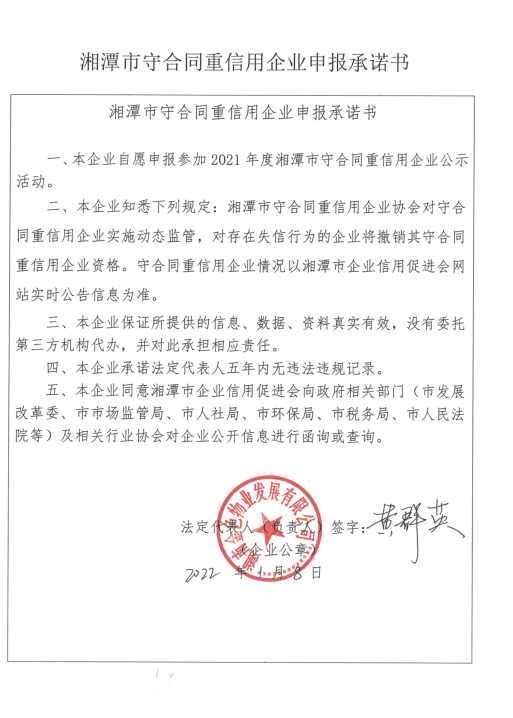 本企業(yè)根據(jù)《湘潭市守合同重信用企業(yè)申報規(guī)定》等編制 2021 年度企業(yè)信用報告書,并保證本報告書內(nèi)容真實、準(zhǔn)確、完整。