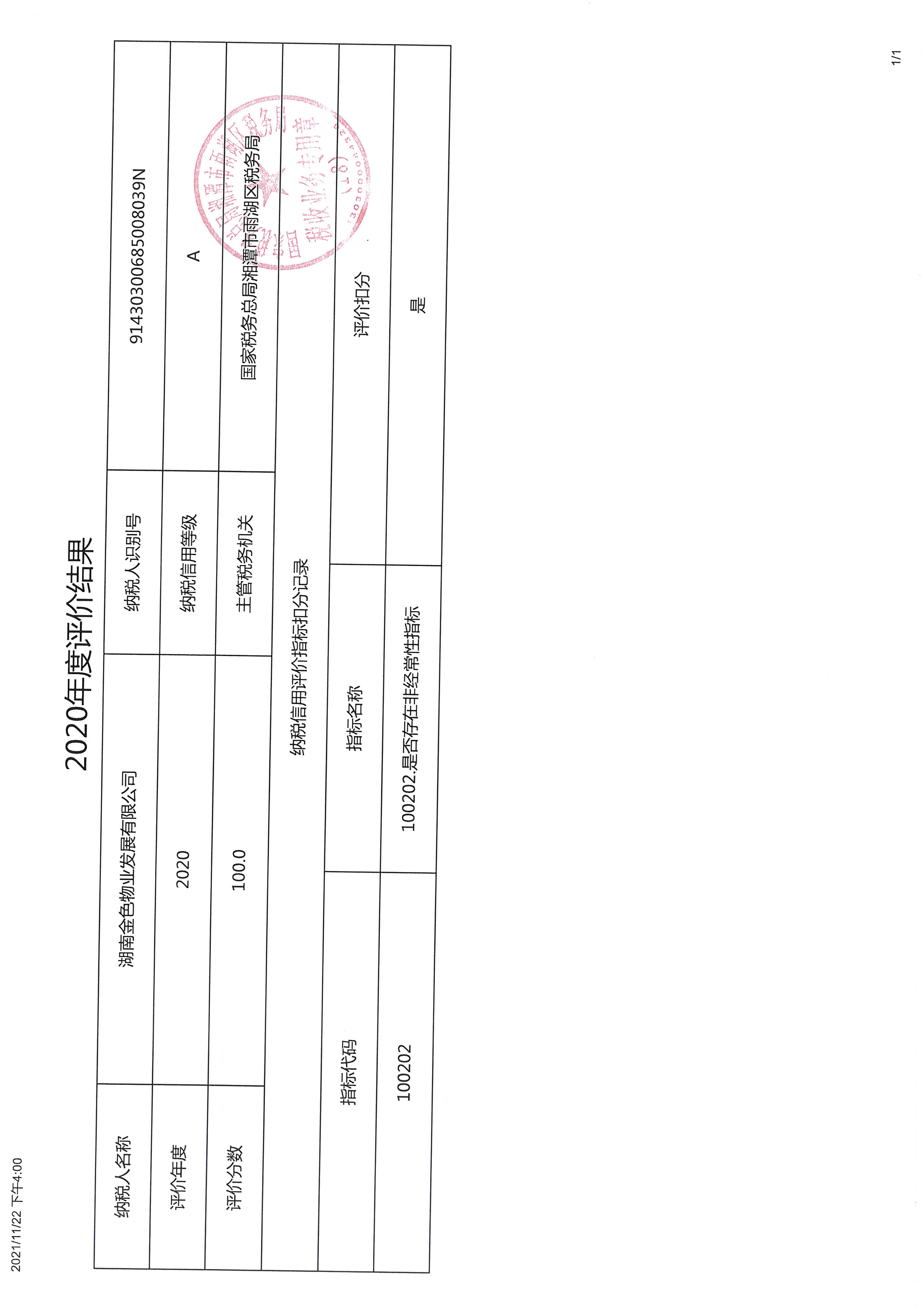 企業(yè)納稅信用等級報告: 國家納稅信用評價2020年(1).jpg