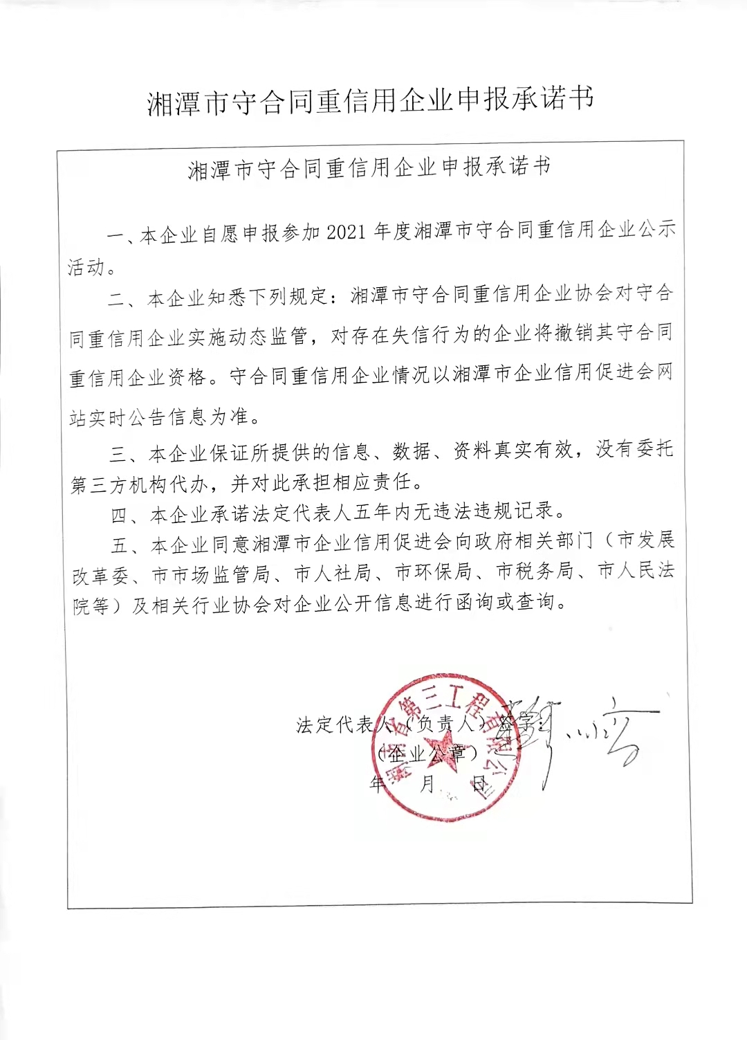 本企業(yè)根據(jù)《湘潭市守合同重信用企業(yè)申報規(guī)定》等編制 2021 年度企業(yè)信用報告書,并保證本報告書內(nèi)容真實、準(zhǔn)確、完整。