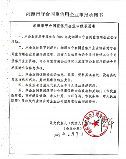 本企業(yè)根據(jù)《湘潭市守合同重信用企業(yè)申報(bào)規(guī)定》等編制 2022 年度企業(yè)信用報(bào)告書(shū),并保證本報(bào)告書(shū)內(nèi)容真實(shí)、準(zhǔn)確、完整。
