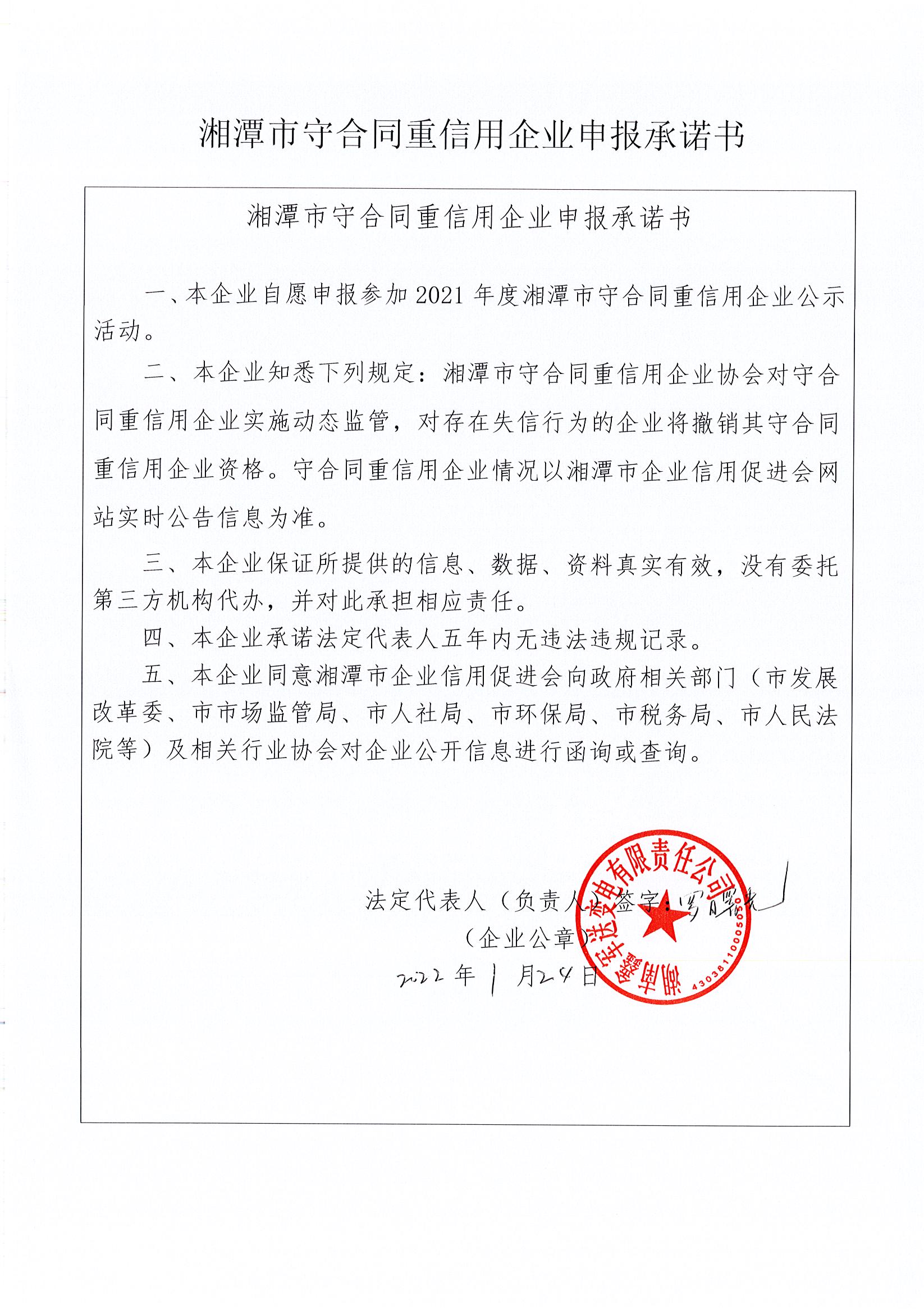 本企業(yè)根據(jù)《湘潭市守合同重信用企業(yè)申報規(guī)定》等編制 2021 年度企業(yè)信用報告書,并保證本報告書內(nèi)容真實、準(zhǔn)確、完整。