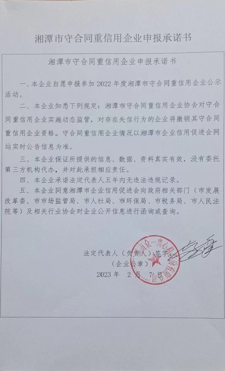本企業(yè)根據(jù)《湘潭市守合同重信用企業(yè)申報(bào)規(guī)定》等編制 2022 年度企業(yè)信用報(bào)告書(shū),并保證本報(bào)告書(shū)內(nèi)容真實(shí)、準(zhǔn)確、完整。