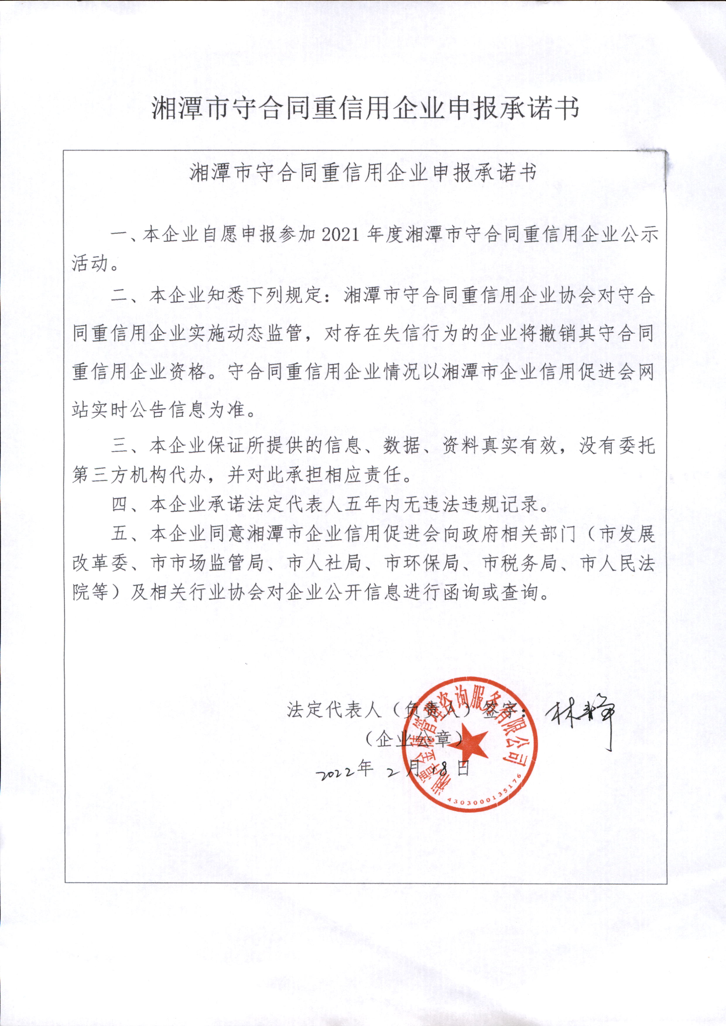 本企業(yè)根據(jù)《湘潭市守合同重信用企業(yè)申報(bào)規(guī)定》等編制 2021 年度企業(yè)信用報(bào)告書,并保證本報(bào)告書內(nèi)容真實(shí)、準(zhǔn)確、完整。