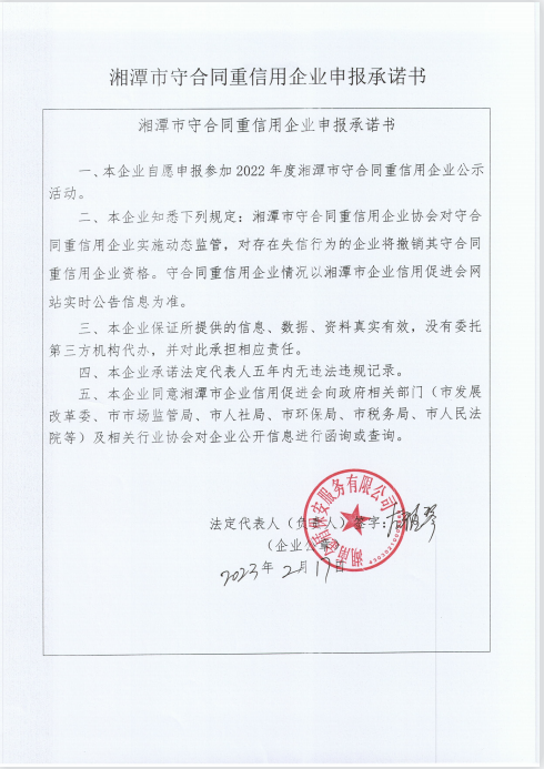 本企業(yè)根據(jù)《湘潭市守合同重信用企業(yè)申報(bào)規(guī)定》等編制 2022 年度企業(yè)信用報(bào)告書,并保證本報(bào)告書內(nèi)容真實(shí)、準(zhǔn)確、完整。
