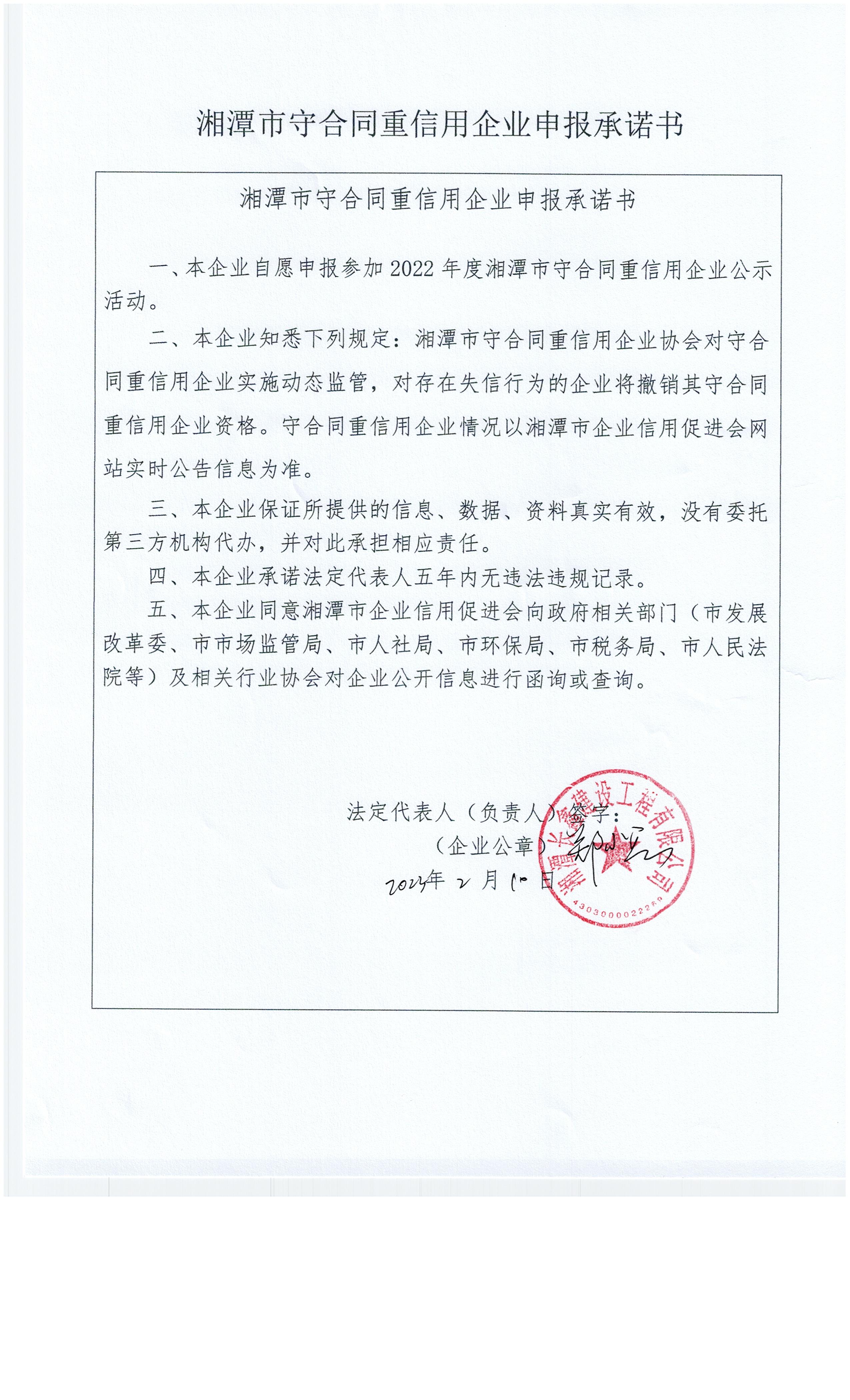 本企業(yè)根據(jù)《湘潭市守合同重信用企業(yè)申報(bào)規(guī)定》等編制 2022 年度企業(yè)信用報(bào)告書(shū),并保證本報(bào)告書(shū)內(nèi)容真實(shí)、準(zhǔn)確、完整。